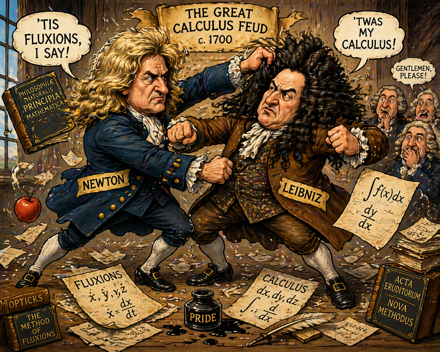 Why were they fighting? They had two competing mathematical systems, and they were trying to convince the European scientific community to adopt one as a standard. Leibniz won out, which you can tell because he named his system, calculus.